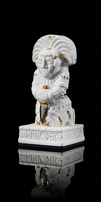 The biscuit porcelain figures, adorned with gold and platinum, recall priests, warriors, and guardians of sacred temples. White symbolizes clarity, light, and divine order. Deep turquoise represents wealth, eternity, and the energy of life.
